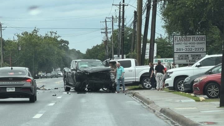 According to League City Police, the crash occurred around 12:55 p.m. when a white Ford F-150 traveling eastbound veered into oncoming traffic and collided with a black Dodge Ram heading westbound.