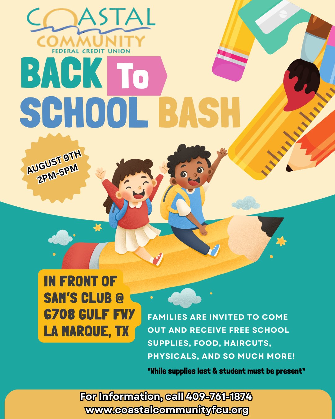 LA MARQUE – On August 9th, from 2-5 PM, the Coastal Community Federal Credit Union will be holding its 19th annual Back To School Bash. The event will be held at the credit union, in front of Sam’s Club. It will include free school supplies, food, haircuts, physicals, and more. All students and family members from Galveston County are encouraged to attend.