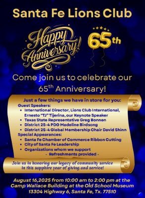 SANTA FE – The Santa Fe Lions Club will mark its 65th anniversary with a special celebration on Saturday, August 16th. The event, including a ribbon cutting ceremony by the chamber will take place at 13304 Highway 6, beginning at 10 a.m.