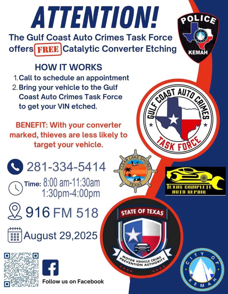 KEMAH — The Kemah Police Department, in partnership with the Clear Lake Shores Police Department, the Galveston County Sheriff’s Department, and the Gulf Coast Auto Crimes Task Force, will host a free catalytic converter etching program on Friday, August 29.