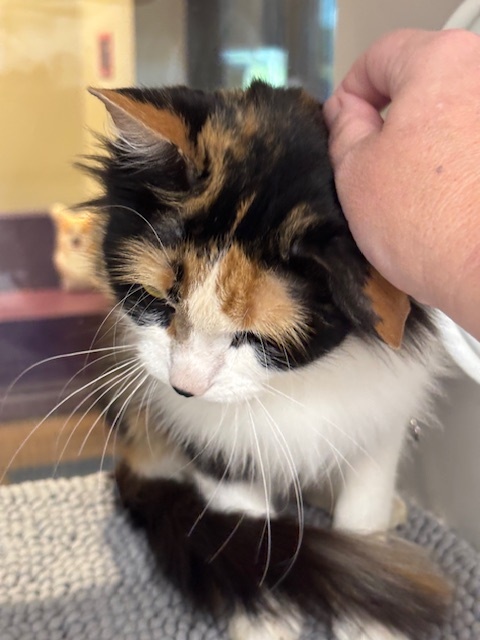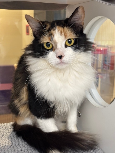 Hi, I’m Laya! I’m a 2-year-old medium-haired calico, and everyone says I’m as sweet as can be. I adore chin scratches and could play with toys all day long.