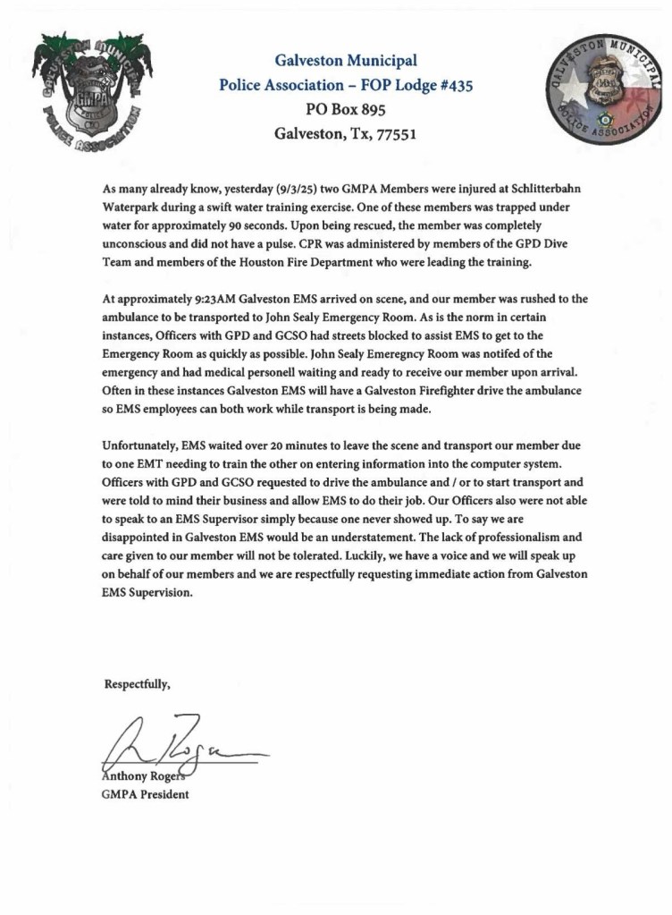 “To say we are disappointed in Galveston EMS would be an understatement,” GMPA President Anthony Rogers wrote in the release. “The lack of professionalism and care given to our member will not be tolerated.”