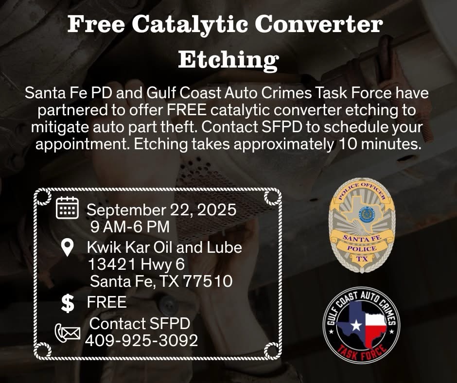 SANTA FE — The Santa Fe Police Department is teaming up with Auto Crimes investigators to help drivers protect their vehicles from theft. A free catalytic converter etching event will be held on Monday, September 22, 2025, from 9 a.m. to 6 p.m. at Kwik Kar Oil and Lube, 1341 Hwy 6 in Santa Fe.