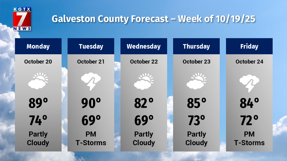 GALVESTON COUNTY – After a sunny and warm start to the week, showers and thunderstorms are expected to return to Galveston County beginning Tuesday and continuing into the weekend.