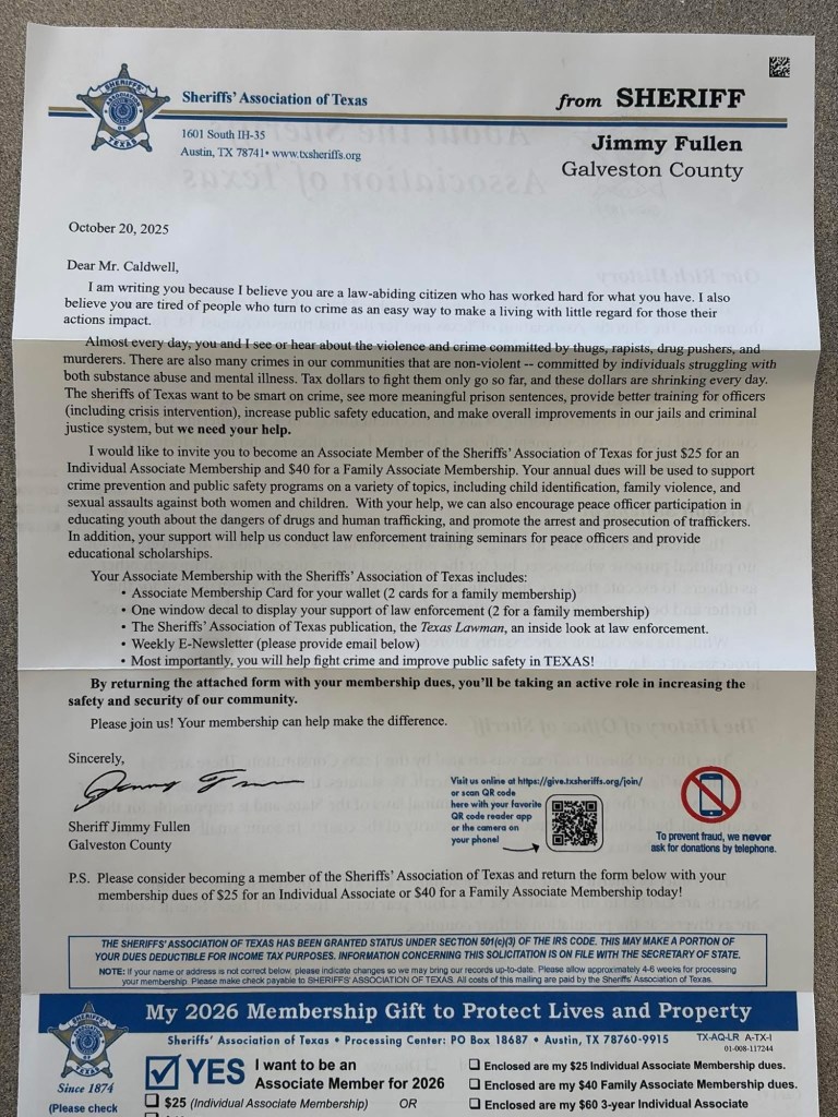 The Sheriffs’ Association of Texas, a nonprofit based in Austin, conducts annual membership drives to raise funds for training and outreach. Similar letters have drawn attention elsewhere in the state in recent years.