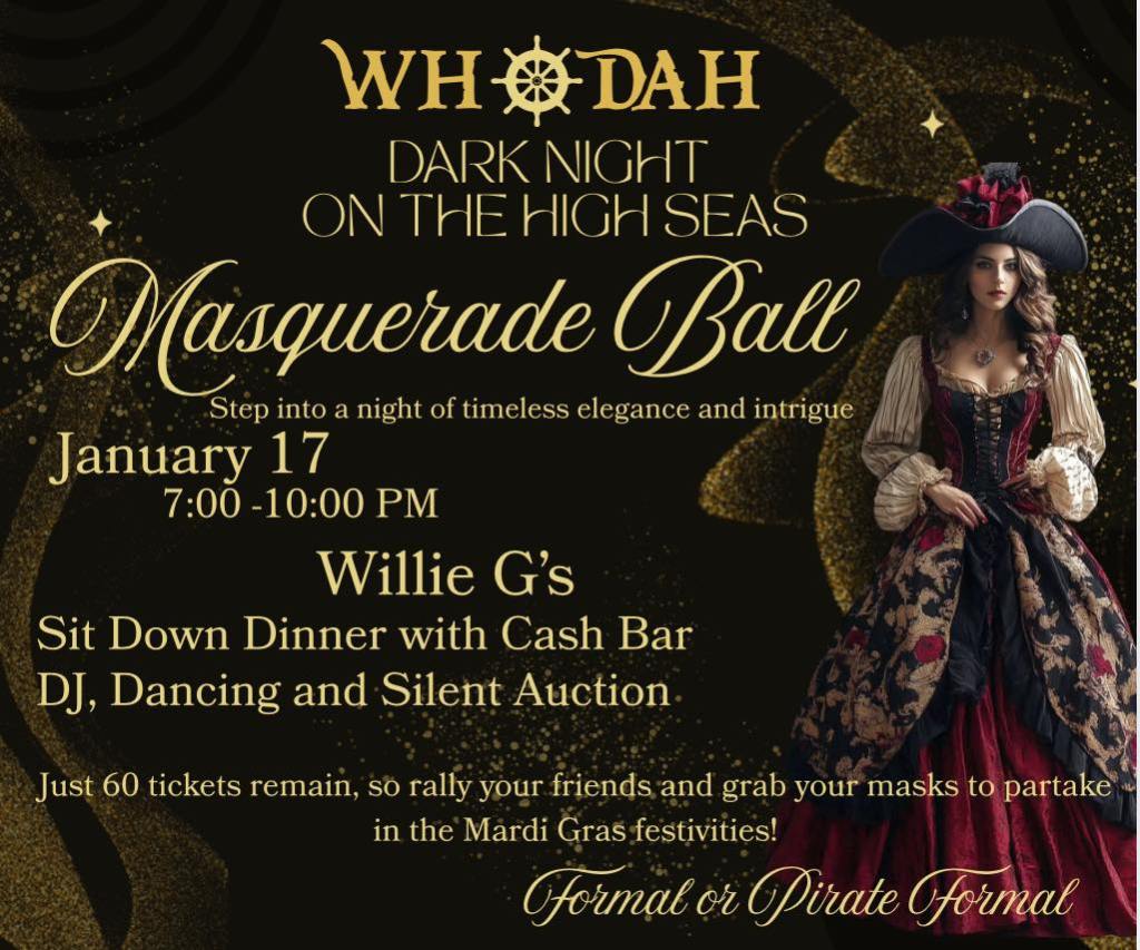 WhoDah Krewe will host its first-ever masquerade ball, Dark Night on the High Seas, on Saturday, January 17, at 7 p.m. The event will take place at 2100 Harborside Drive. Online registration for the ball is now closed, with tickets previously priced at $95 per person.