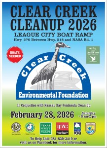 LEAGUE CITY – The Clear Creek Environmental Foundation, a local nonprofit organization, will hold its annual waterway cleanup on February 28, marking 25 years of efforts to remove trash and debris from Clear Creek and Clear Lake.